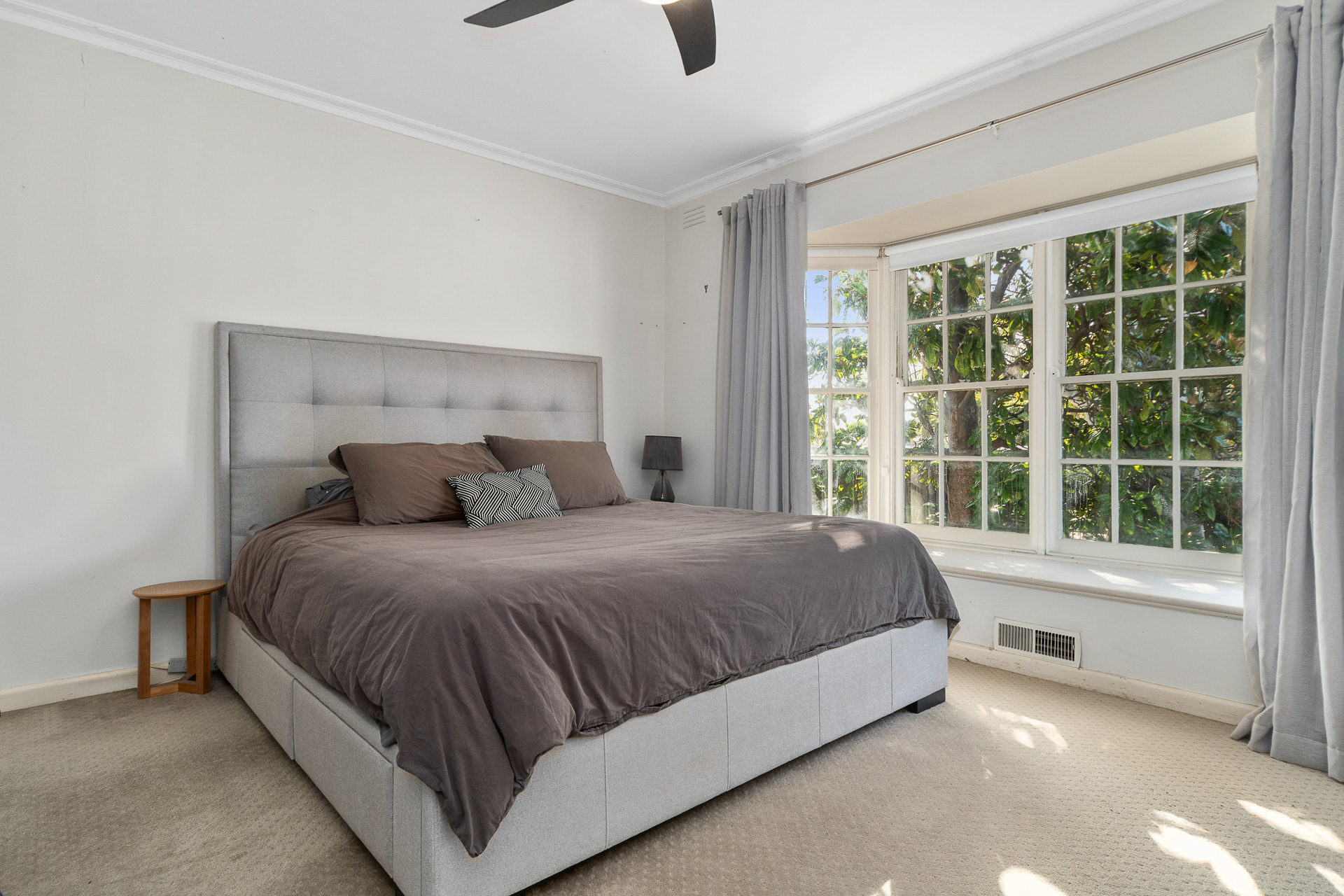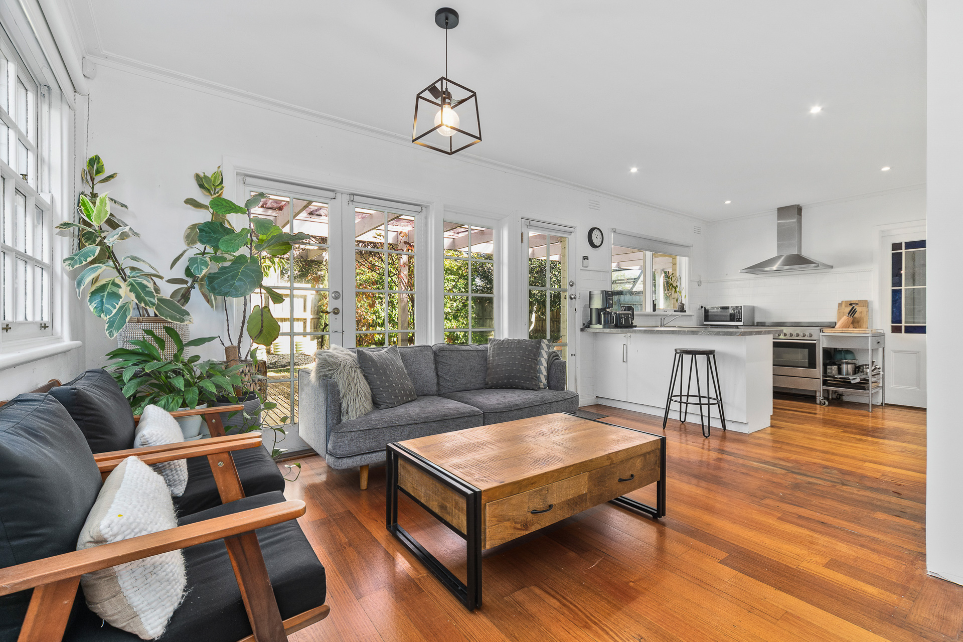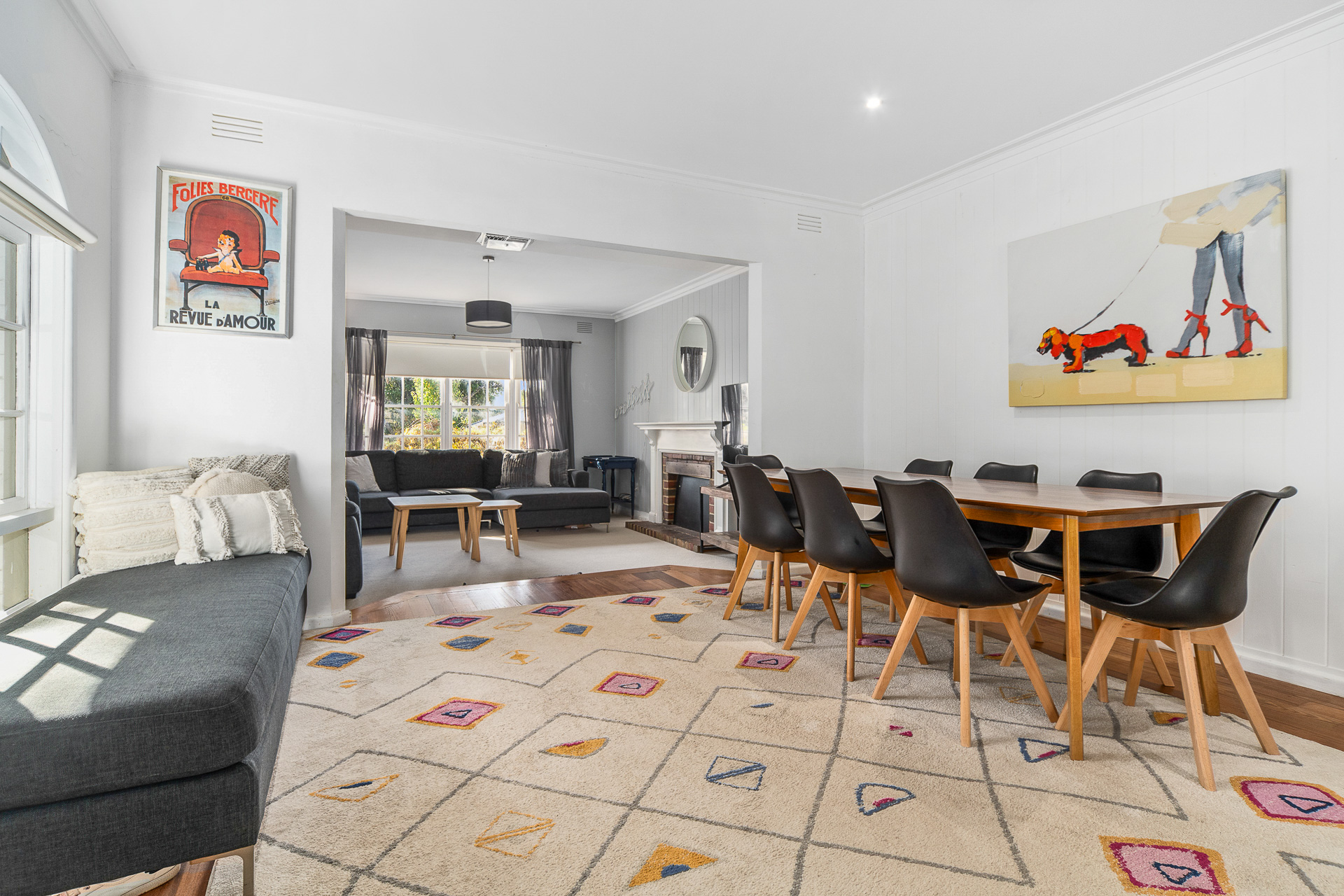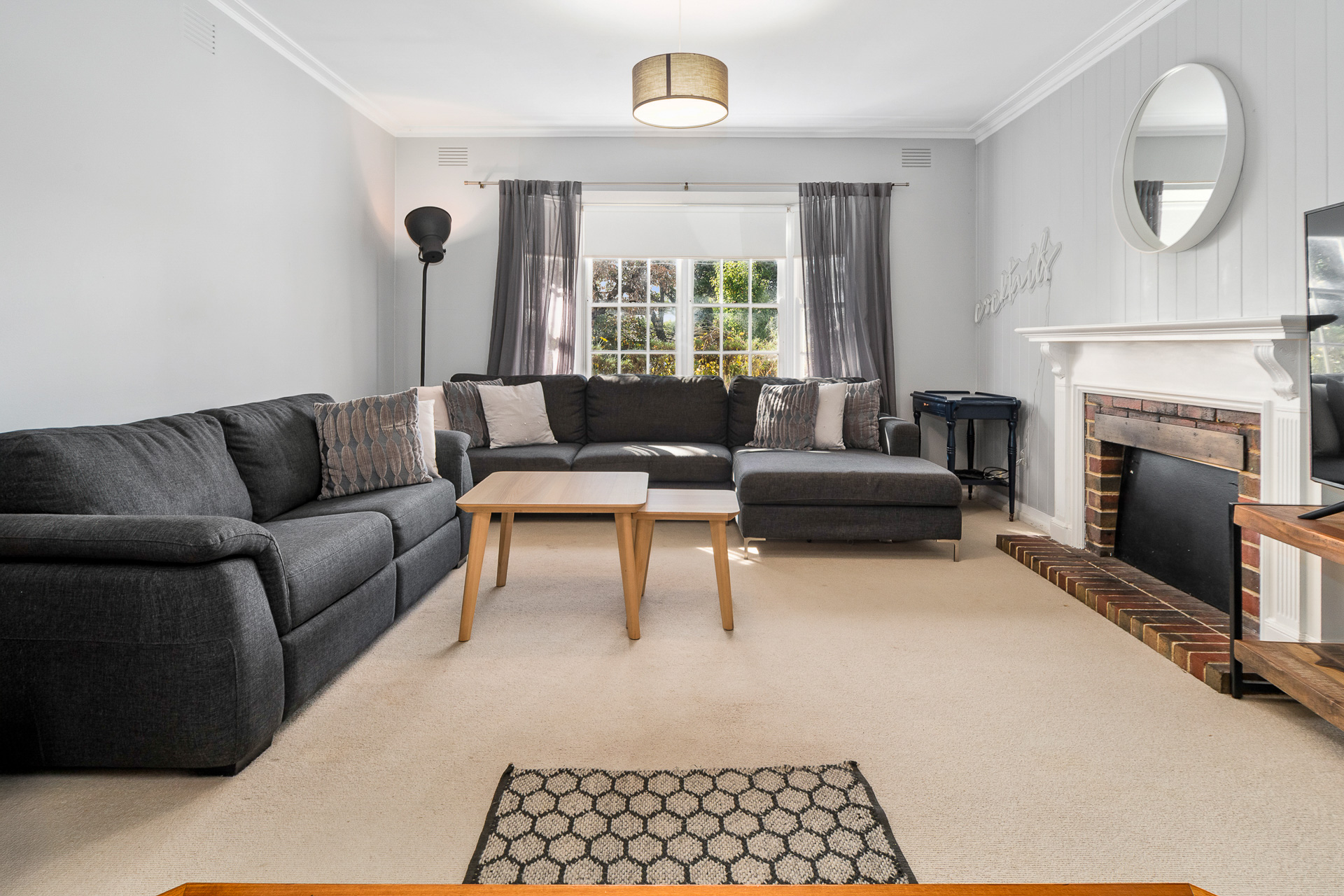 - Naturally light filled central living zone with sheers adorning the windows giving a soft & relaxing vibe. The Open fire place is decorative only & is not in use.